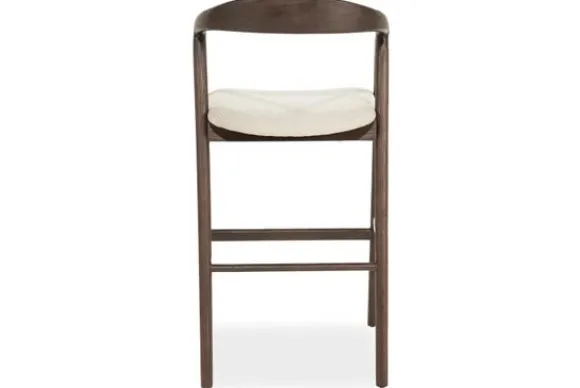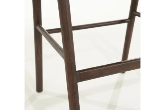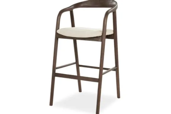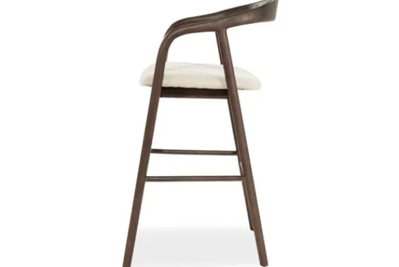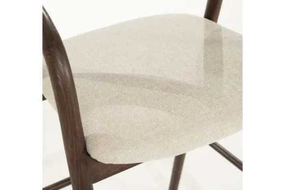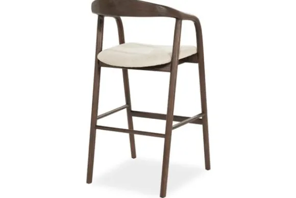 De zitting is bekleed met een zachte, lichtgekleurde stof die een prachtig contrast vormt met het donkere hout. Dit spel tussen licht en schaduw geeft de barkruk een gelaagde visuele diepte, alsof hij zich moeiteloos aanpast aan elk interieur waar hij in staat.