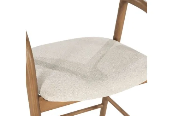 De zitting is bekleed met een subtiel geweven stof in een neutrale tint die mooi contrasteert met het lichtbruine hout.