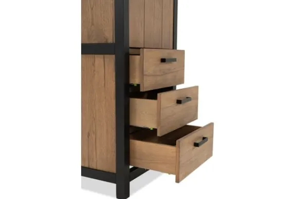 De kast is gemaakt van massief eikenhout met een zichtbare, natuurlijke nerfstructuur. Het zwarte metalen frame omlijst het geheel en zorgt voor een robuuste uitstraling met een verfijnde twist.