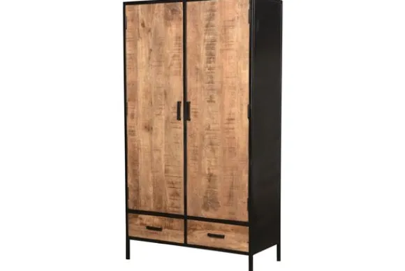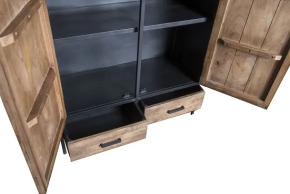 Bergkast Sturdy van het merk Livingfurn is gemaakt van mangohout in combinatie met gecoat staal. Deze combinatie zorgt voor het stoere uiterlijk van dit meubel. Mangohout is een duurzame houtsoort, heeft een fijne nerf en is uniek omdat elk stuk er net iets anders uitziet. Deze kast heeft twee grote deuren, waarachter aan allebei de kanten drie planken zitten. Onder de deuren zitten twee lades.