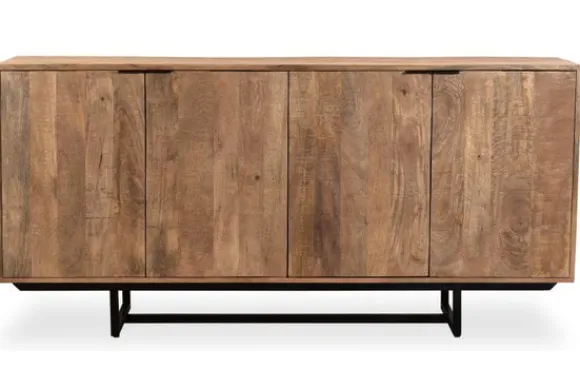 Dressoir Valdez van het merk Livingfurn is gemaakt van mangohout in combinatie gecoat staal. Mangohout is een duurzame houtsoort, heeft een fijne nerf en is uniek, omdat elk stuk er net iets anders uitziet. De kast staat op hoge poten van zwartkleurig gecoat staal. Deze kast heeft in het midden drie lades, daarnaast aan beide kanten een deur en bovenin nog één groot open vak.