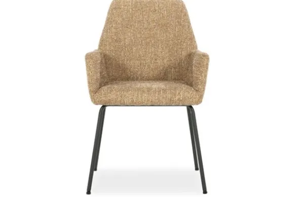 De gecoate metalen poten in een elegante zwarte afwerking geven het ontwerp een verfijnde, moderne basis. Ze zorgen voor stabiliteit en brengen een krachtig contrast met het warme bovenwerk. De comfortabele armleuningen en licht toelopende rug zorgen voor een ontspannen zitervaring, ideaal voor lange, gezellige diners.