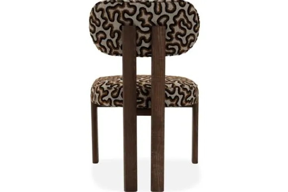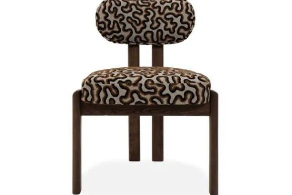 Eetkamerstoel Bente van het merk Studio Hendrik trekt met de speelse bekleding met organisch patroon meteen de aandacht en geeft de stoel een karaktervolle uitstraling. Het stevige frame van essenhout zorgt voor een warme, natuurlijke basis. De zachte rondingen van rugleuning en zitting brengen een vleugje zachtheid in elke eetruimte.
