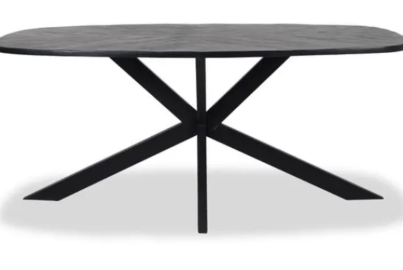 Het tafelblad is gemaakt van mangohout in de kleur zwart met een verfijnd visgraat motief, dat in een kruispatroon is gelegd. De houtsoort heeft vele kleurschakeringen en ongelijkheden in het oppervlak, wat een natuurlijke en unieke look geeft.