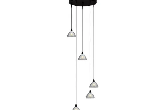 Hanglamp 2226-05-06-35-5-DW Caterina van het merk Masterlight is een chique moderne lamp. De hanglamp heeft vijf lampenkappen die gemaakt zijn van mat glas met een diameter van 12 centimeter die zigzag onder elkaar hangen. De moderne glazen lampkappen combineren mooi met de mat zwarte armatuur en zijn in de hoogte verstelbaar tot een maximale lengte van 200 centimeter. Boven de eettafel, salontafel of boven het keukeneiland. De hanglamp komt goed tot zijn recht in verschillende soorten ruimtes. Bepaal zelf de sfeer door de lamp eenvoudig aan te sluiten op een dimmer. Zacht licht voor een romantisch diner en wat harder licht als je gezellig samen met vrienden een spelletjesavond hebt. De lichtbron is inclusief bij deze lamp en is dimbaar met een externe dimmer.