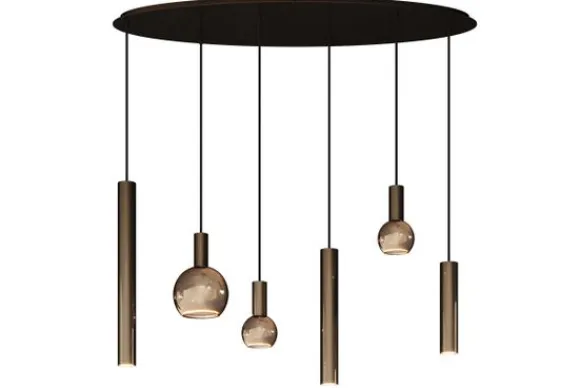 Hanglamp Riva 4395 van het merk Ztahl is een stijlvolle designlamp die zich onderscheidt door het plafondplateau en de combinatie van cilindervormige kappen met glazen bollen. Het elegante lijnenspel en de speelse variatie in vormen maken deze lamp een echte blikvanger in je interieur.