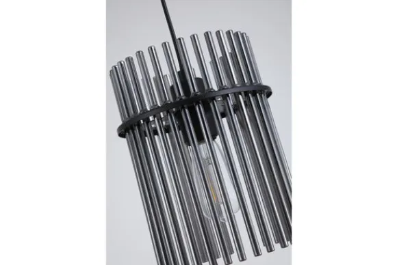 Hanglamp Swizzle 55620SM van het merk Searchlight is een stijlvolle eyecatcher die luxe en elegantie combineert. De lamp is gemaakt van metaal en glas, waarbij de zwarte glazen buisjes rondom de lichtbron zorgen voor een prachtig spel van licht en schaduw. Het moderne ontwerp en de donkere kleur geven een verfijnde, industriële uitstraling die perfect past in diverse interieurs.