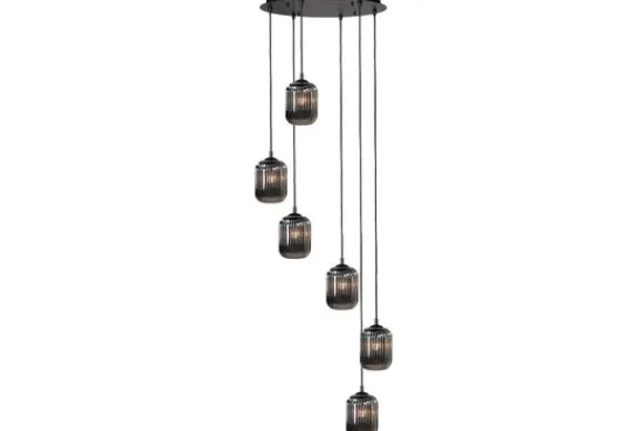 Hanglamp Castel Zwart van het merk Highlight heeft zes lampen met rookglazen lampenkappen. Deze zes lampen zijn verstelbaar in lengte. De maximale lengte is 160 cm. De lampen kunnen op verschillende hoogtes gehangen worden, waardoor je een speels effect creeërt. Vanwege het rookglas heb je naast sfeervol zijwaarts licht ook goed licht dat naar beneden schijnt.