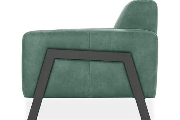 Fauteuil Sorelli van het merk Dutch Comfortline is een hedendaagse stoel met een robuust silhouet, elegante stiksels in de rugleuning en opvallende metalen hoekpoten.