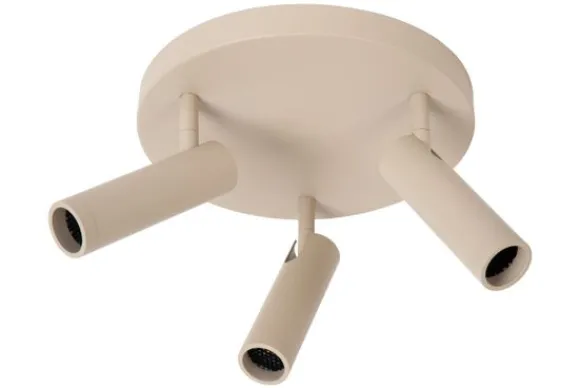 Plafondlamp Grado van het merk Lucide is een krachtige drie-spotlamp met een verfijnde, cilindervormige vormgeving en een taupe, moderne uitstraling. De ronde plafondplaat zorgt voor een harmonieuze balans tussen functionaliteit en design.