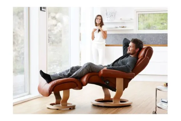 Relaxfauteuil Magic Classic van het merk Stressless is verkrijgbaar in alle kleuren. Tevens is de fauteuil leverbaar in stof en rundleder. Je kunt bij deze fauteuil kiezen uit diverse maten zoals Small, Medium en Large. Deze fauteuil heeft een Plus en Glide Systeem: Aan beide zijden van de fauteuil zit een knop waarmee je de weerstand van de stoel kan aanpassen naar eigen behoefte. Door de knoppen in tegengestelde richting te draaien stel je jouw ideale relaxpositie samen. Op die manier krijgt de nek en de onderrug goede onderstuening. Door de rugleuning naar voren te buigen activeer je de slaapfunctie. Op het moment dan je weer rechtop komt stelt de stoel zichzelf weer bij naar de normale stand.