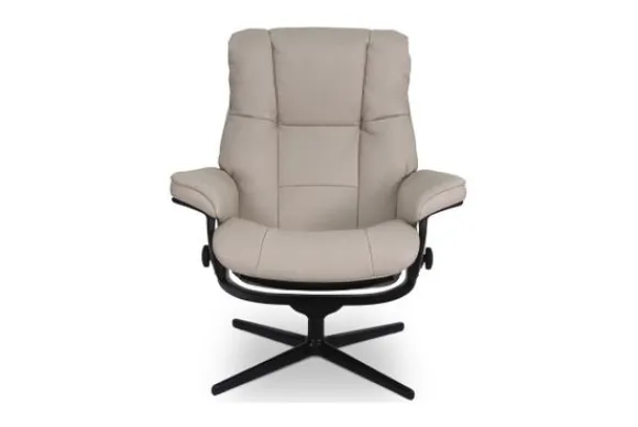 Relaxfauteuil Mayfair Cross van het merk Stressless is verkrijgbaar in alle kleuren. Tevens is de fauteuil leverbaar in stof en rundleder. Je kunt bij deze fauteuil kiezen uit diverse maten zoals Small, Medium en Large. Deze fauteuil heeft een Plus en Glide Systeem: Aan beide zijden van de fauteuil zit een knop waarmee je de weerstand van de stoel kan aanpassen naar eigen behoefte. Door de knoppen in tegengestelde richting te draaien stel je jouw ideale relaxpositie samen. Op die manier krijgt de nek en de onderrug goede onderstuening. Door de rugleuning naar voren te buigen activeer je de slaapfunctie. Op het moment dan je weer rechtop komt stelt de stoel zichzelf weer bij naar de normale stand.
