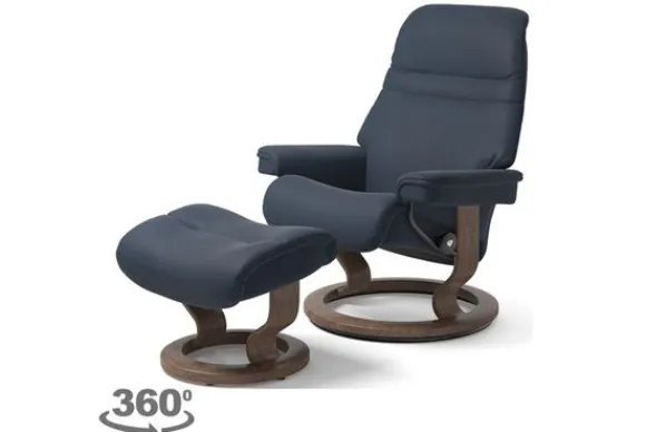 Relaxfauteuil Sunrise Classic van het merk Stressless is verkrijgbaar in alle kleuren. Tevens is de fauteuil leverbaar in stof en rundleder. Je kunt bij deze fauteuil kiezen uit diverse maten zoals Small, Medium en Large. Deze fauteuil heeft een Plus en Glide Systeem: Aan beide zijden van de fauteuil zit een knop waarmee je de weerstand van de stoel kan aanpassen naar eigen behoefte. Door de knoppen in tegengestelde richting te draaien stel je jouw ideale relaxpositie samen. Op die manier krijgt de nek en de onderrug goede ondersteuning. Door de rugleuning naar voren te buigen activeer je de slaapfunctie. Op het moment dan je weer rechtop komt stelt de stoel zichzelf weer bij naar de normale stand.