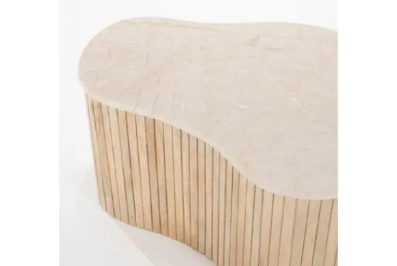 De basis van de tafel is gemaakt van mango hout, bekend om zijn duurzaamheid en mooie, warme uitstraling. Het hout is verticaal geribbeld, wat zorgt voor een mooie textuur en een speelse interactie tussen het strakke marmer en het natuurlijke hout. Deze tafel is perfect voor liefhebbers van natuurlijke materialen en organische vormen, en zal zeker een blikvanger zijn in elke woonkamer.