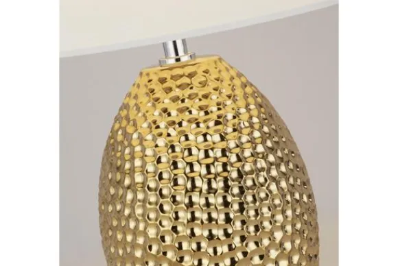 Tafellamp EU1034-1GO Nadine van Searchlight heeft een gouden voetstuk van keramiek en een gestoffeerde witte lampenkap. Deze lamp heeft een E27 fitting.