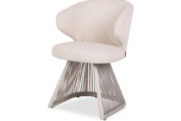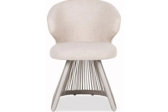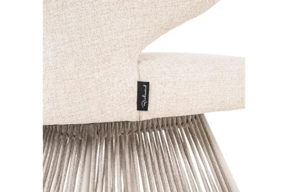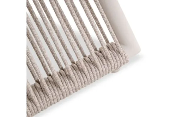 Tuinstoel Nuba is voorzien van een stevige vorm die je lichaam prettig omsluit. De zitting is bekleed met stof in een rustige beige tint die makkelijk te combineren is. De onderkant is opgebouwd uit touw en aluminium wat zorgt voor stabiliteit en een speels lijnenspel.