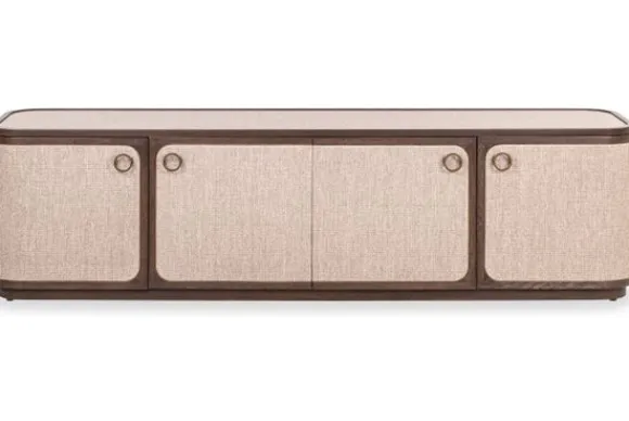 De deuren zijn bekleed met linnen in een zachte zandkleur die mooi samengaat met het donkere eiken frame. De metalen grepen vormen een subtiel accent dat het geheel een eigentijds karakter geeft. Achter de deuren vind je ruime opbergvakken, ideaal om kabels en apparatuur netjes uit het zicht te houden.