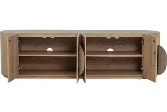 Naast zijn elegante design biedt dit tv-meubel volop opbergruimte achter de deuren voor apparatuur en persoonlijke spullen. De geïntegreerde kabeldoorvoer zorgt ervoor dat snoeren netjes uit het zicht blijven, waardoor de woonkamer opgeruimd oogt.