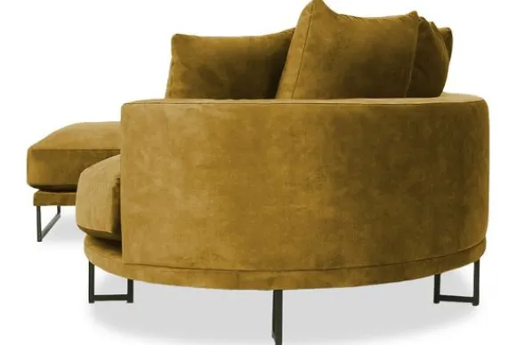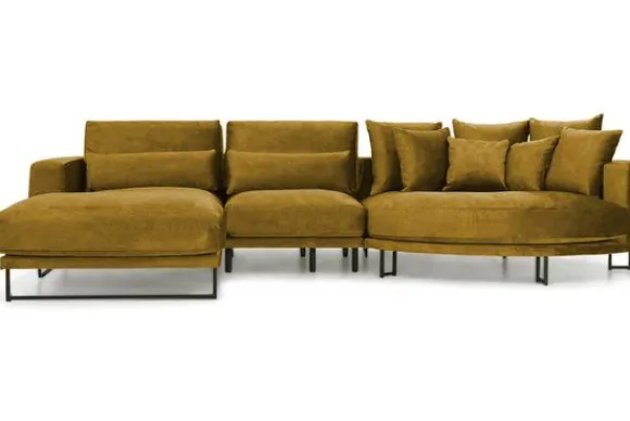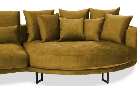 Loungebank Dordoni II van het merk Be Inspired is verkrijgbaar in alle kleuren en in materiaalsoorten zoals ribstof, teddy en velvet. De Dordoni II bank wordt standaard uitgevoerd met alle sierkussens en lendekussens die ook op de foto te zien zijn. De rugkussens daar achter zijn lekker hoog, deze combinatie zorgt voor een goede ondersteuning van de rug. Alle rugkussens zitten los en zijn omkeerbaar, de zitkussens zitten vast met klittenband. Het unieke aan de Dordoni II is het ronde loungegedeelte. Je kunt hier lekker wegkruipen tussen alle sierkussens. Deze bank oogt ruimtelijk door de hoge metalen sledepoten.