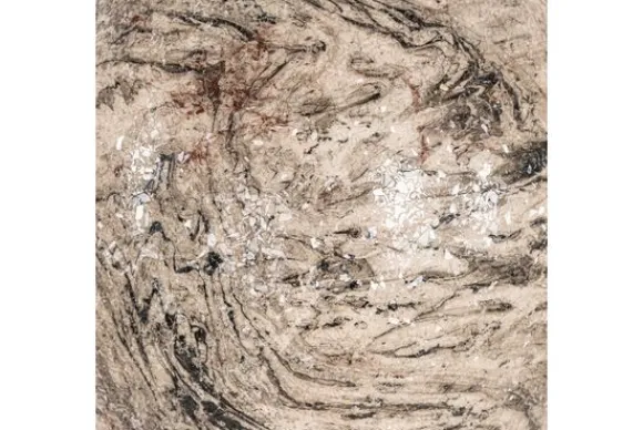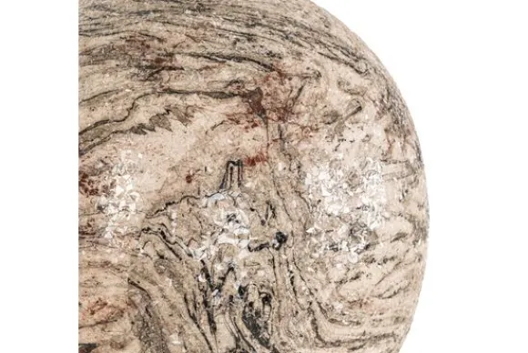 De warme aardetinten en glanzende details vormen een uniek marmerachtig patroon.