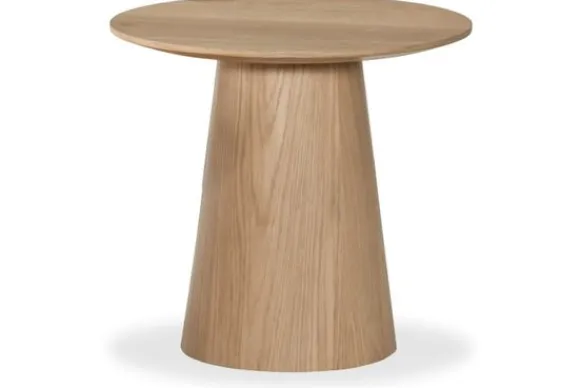 Bijzettafel Novero van het merk Livingfurn in de kleur Naturel heeft een rond blad en een taps toelopende kolompoot. De tafel is uitgevoerd in een naturel kleur met een zichtbare houtstructuur. Deze bijzettafel past goed binnen een Japandi interieur en sluit ook aan bij een Scandinavisch woonstijl.