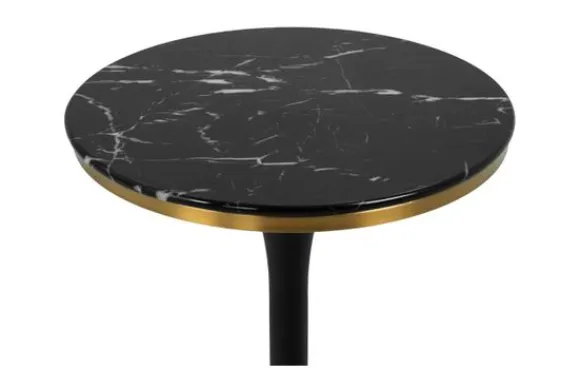 Bijzettafel Julin van het merk Aynur Nova is leverbaar in verschillende maten. Deze hoektafel heeft een rond blad en ook een ronde poot. De tafel krijgt een chique uitstraling door het zwarte marmeren blad met de gouden rand en de metalen poot.