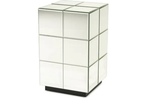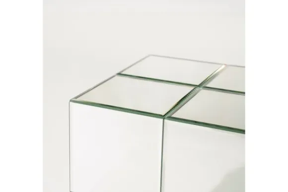 Het kubusvormige ontwerp met strak verdeelde panelen geeft de bijzettafel een eigentijds karakter.