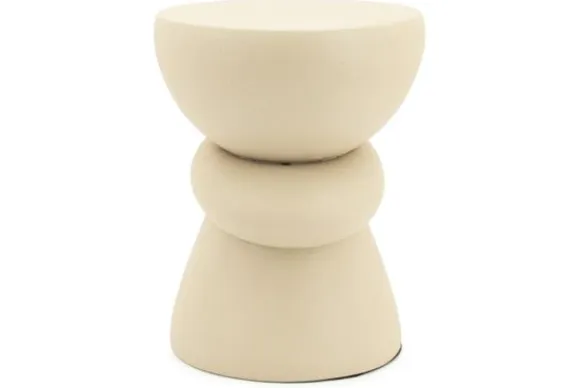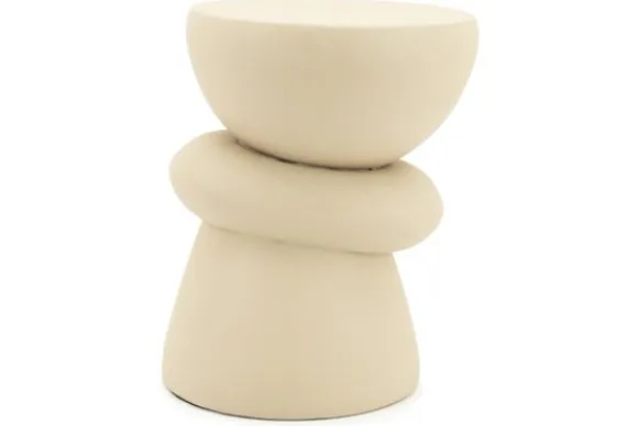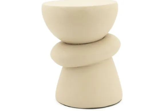 Bijzettafel Kerun bestaat uit ronde, organisch gevormde delen die op een harmonieuze manier op elkaar balanceren. Dit geeft de tafel een artistieke uitstraling, alsof het een modern kunstobject is dat functionaliteit en esthetiek samenbrengt.