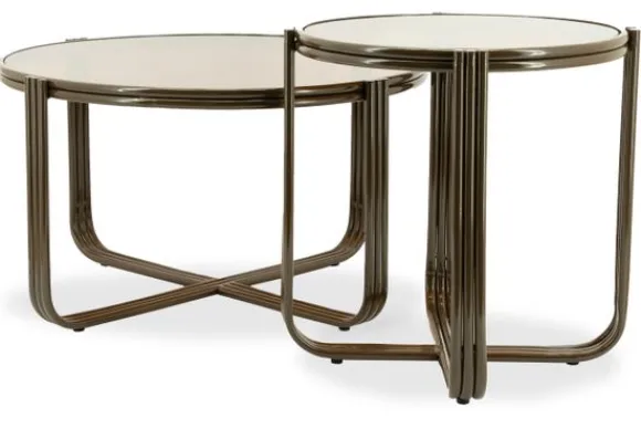 Het glazen tafelblad rust op een bijzonder onderstel dat bestaat uit gebogen metalen buizen die samen een kruismotief vormen.