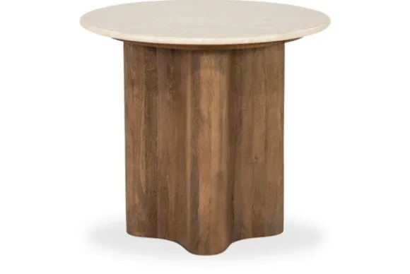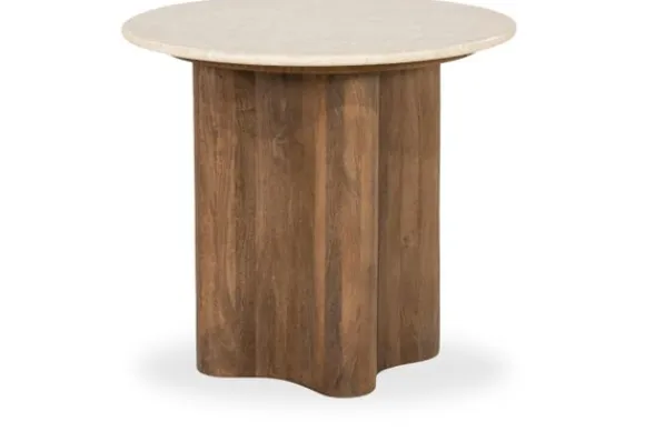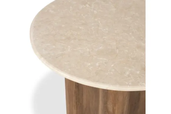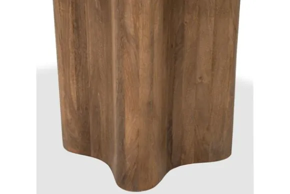 Bijzettafel Bodhi 96579 van het merk Eleonora is uitgevoerd met een rond blad van botochino en een massieve voet van mangohout. Het blad heeft een lichte kleur met zachte kleurnuances. De voet heeft een warme bruine tint met een zichtbare houtstructuur. De vorm van de voet is rond en licht golvend afgewerkt. Dit geeft de tafel een stabiele en stevige basis.