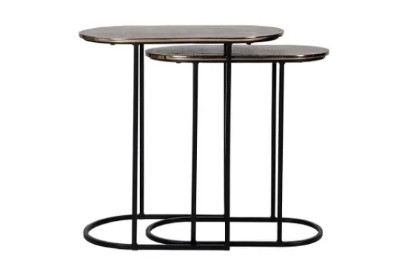 Bijzettafel Chandon 210432 van het merk Richmond Interiors heeft een chique uitstraling. De bijzettafel bestaat uit een set van 2. De bladen zijn gemaakt van gegoten aluminium in de kleur champagne goud. Het onderstel is van zwart gepoedercoat staal. De grote tafel heeft een afmeting van 56 cm hoog, 57 cm breed en 31,5 cm diep. De kleine tafel heeft een afmeting van 50,5 cm hoog, 51 cm breed en 26 cm diep.