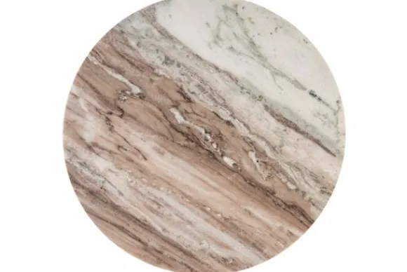Het ronde tafelblad is vervaardigd uit luxueus marmer met subtiele aders in zachte, aardse tinten. Deze natuurlijke textuur zorgt voor een verfijnde uitstraling en maakt elk exemplaar uniek.
