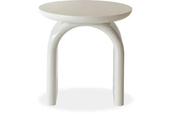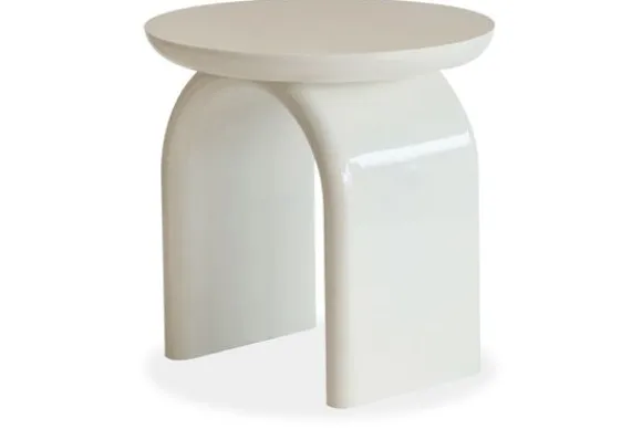 Bijzettafel Merrick 214206 van het merk Richmond Interiors in de kleur Coconut White heeft een opvallend rond blad met een stevige boogvormige poot. De hoogglans afwerking zorgt voor een strakke, moderne look.