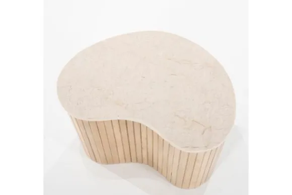 De basis van de tafel is gemaakt van mango hout, bekend om zijn duurzaamheid en mooie, warme uitstraling. Het hout is verticaal geribbeld, wat zorgt voor een mooie textuur en een speelse interactie tussen het strakke marmer en het natuurlijke hout. Deze tafel is perfect voor liefhebbers van natuurlijke materialen en organische vormen, en zal zeker een blikvanger zijn in elke woonkamer.