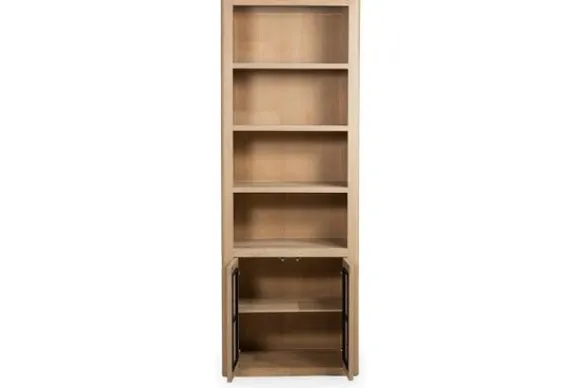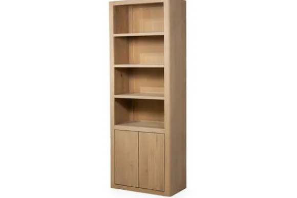 De boekenkast Tenna heeft een slimme indeling met zowel open vakken als twee dichte deuren aan de onderzijde. Zo combineert de kast praktisch opbergen met een luchtige uitstraling.
