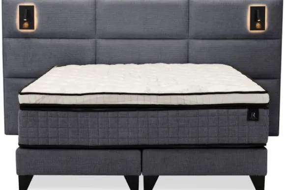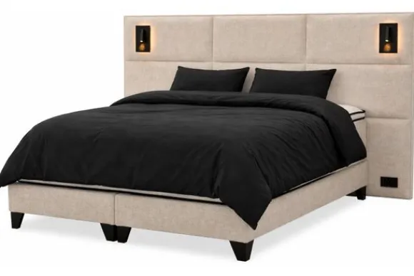 Boxspring Arizona Luxe van het merk King Koil is een complete boxspring met een hoog hoofdbord, matras en topper. Het hoofdbord Arizona Luxe is voorzien van LED verlichting, een stopcontact en een USB aansluiting. Het hoofdbord is 140 cm hoog en steekt aan beide kanten ongeveer 50 cm uit. De boxspring staat op zwarte poten en vormt een stevige basis voor het bed.