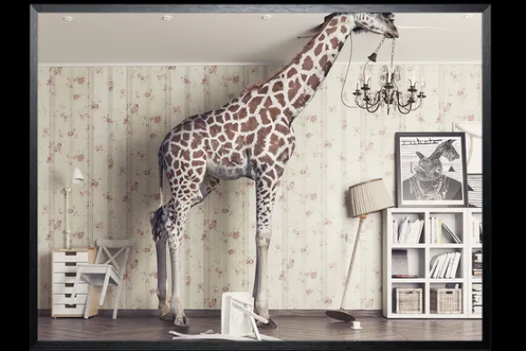 Art Print Giraf in de gang SHJ605 van het merk Luxe Framing Art is verkrijgbaar in verschillende afmetingen. Op deze print zie je een giraf die in een kamer staat, zijn hoofd gaat door het plafond heen en hij houdt de kandelaar in zijn bek. Deze Art Print wordt standaard met een zwarte lijst geleverd.