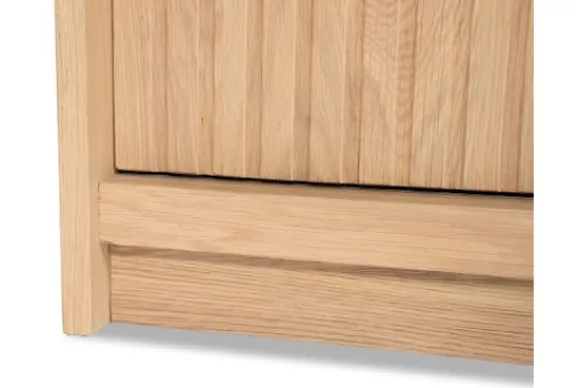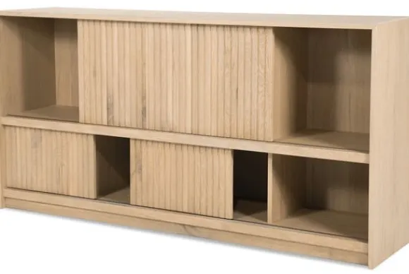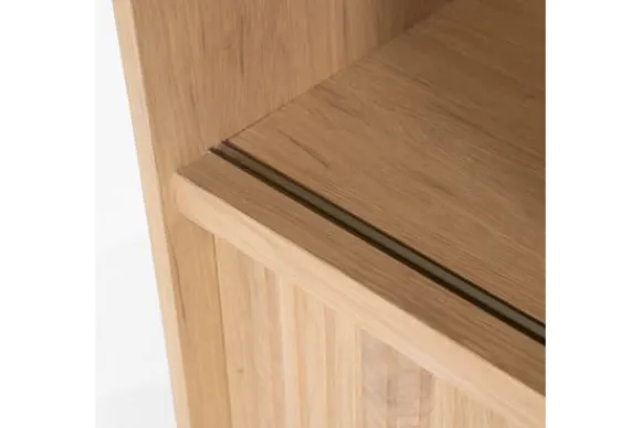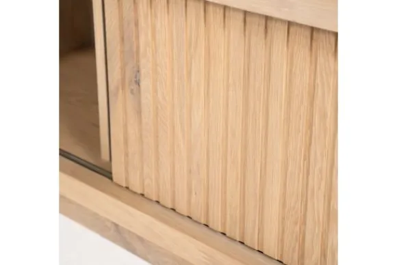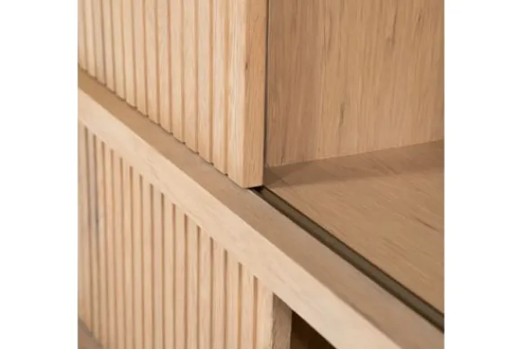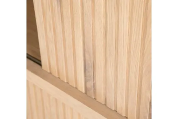 Het dressoir is gemaakt van eikenhout en eiken fineer. De houtstructuur blijft goed zichtbaar en zorgt voor een natuurlijke uitstraling. De schuifdeuren zijn uitgevoerd met verticale ribbels en maken het mogelijk om delen van de vakken af te sluiten.