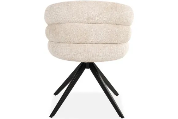 De stoel is bekleed met een warme, lichtbeige stof die zacht aanvoelt en rust uitstraalt. De comfortabele foamvulling zorgt voor extra zitgemak. De zwarte metalen spinpoot vormt een krachtig contrast met de lichte bekleding en geeft de stoel een eigentijds karakter.