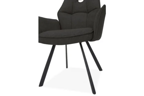 Het verfijnde stiksel in de rugleuning benadrukt de vorm en geeft de stoel een speels detail. De zwarte metalen poten zorgen voor een stoer contrast en bieden stabiliteit.