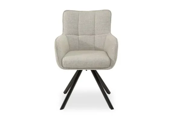 Eetkamerstoel Tori van het merk Livingfurn is bekleed met stof in de kleur Sand en staat op een zwart metalen onderstel. De ruime zitting met armleuningen en het comfortabele zitkussen zorgen voor een fijne en ontspannen zit aan tafel.