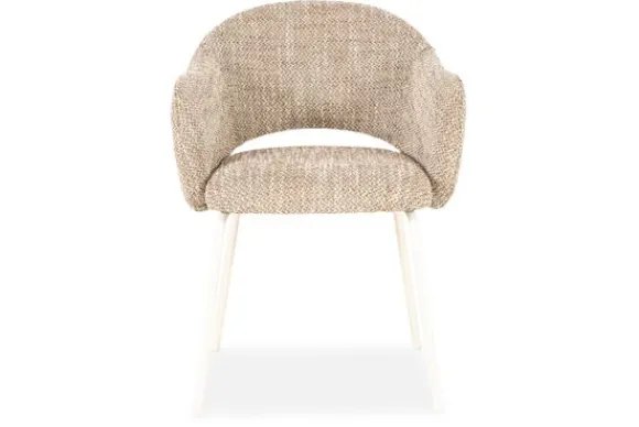 De subtiele opening tussen rug en zitting geeft de eetstoel een luchtig karakter. De zachte bekleding nodigt uit tot lang tafelen, terwijl de slanke metalen poten zorgen voor een stabiele basis.