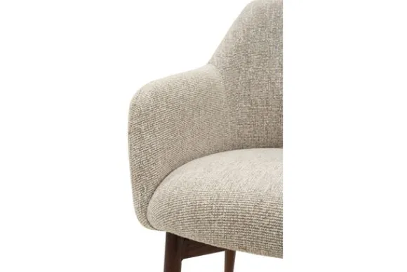 De stoel is bekleed met de fijne stof Lodge Shiitake 124. De bekleding voelt zacht aan en past in woonstijlen zoals Japandi of Modern.