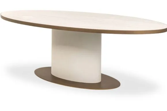 Het robuuste middenonderstel geeft de tafel een moderne en stevige basis. De combinatie van de zachte, lichte tinten met het subtiele goudkleurige accent zorgt voor een harmonieus geheel dat elegantie en comfort samenbrengt.