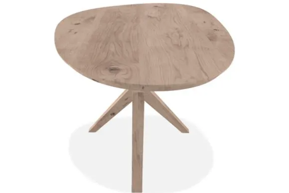 Eettafel Alvin van het merk De Houtmaatschappij heeft een kiezelvormig blad dat is uitgevoerd met een 2+2 cm opgedikte rand. Dit zorgt ervoor dat de poten netjes onder het blad vallen en het geheel stevig is afgewerkt. Maten 240 cm met een diepte van 130 cm en groter hebben een volledig massief blad van 4 cm dik.