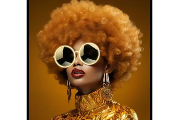 Glasschilderij Gele Vrouw 080080LED-009 van het merk Ter Halle toont een krachtige vrouw met een grote ronde bril en gouden accenten, waarbij warme geel- en oranjetinten zorgen voor een luxe en stijlvolle uitstraling.