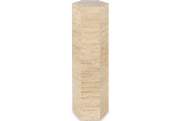 Pilaar Vespin 212985 van het merk Richmond Interiors is gemaakt van travertine. Travertin is een kalksteen in een beige tint die ontstaat in warmwaterbronnen met veel kalk in het water. Deze steensoort kenmerkt zich door de kleine gaatjes die ontstaan door het schuren van takjes, stenen en blaadjes in het water. Travertin is een duurzame steensoort, robuust en makkelijk schoon te maken met een vochtige doek. Elk stuk is uniek, je haalt zo dus echt iets unieks in huis! De pilaar heeft een zeshoekige vorm, hierdoor is het een echte eyecatcher in jouw interieur. Om te pilaar goed tot zijn recht te laten komen, kan je je mooiste vaas met bloemen op zetten.