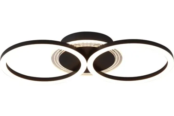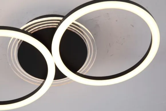 Plafondlamp Contour 13651BK van het merk Searchlight is een moderne lamp met een opvallend ontwerp van drie verlichte ringen. De lamp is uitgevoerd in zwart metaal en voorzien van geïntegreerde, dimbare LED-verlichting die zorgt voor een warme en gelijkmatige lichtverdeling.