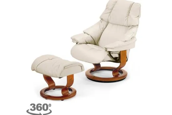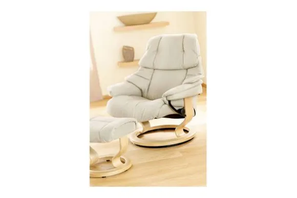 Relaxfauteuil Reno Classic van het merk Stressless is verkrijgbaar in alle kleuren. Tevens is de fauteuil leverbaar in stof en rundleder. Je kunt bij deze fauteuil kiezen uit diverse maten zoals Small, Medium en Large. Deze fauteuil heeft een Plus en Glide Systeem: Aan beide zijden van de fauteuil zit een knop waarmee je de weerstand van de stoel kan aanpassen naar eigen behoefte. Door de knoppen in tegengestelde richting te draaien stel je jouw ideale relaxpositie samen. Op die manier krijgt de nek en de onderrug goede ondersteuning. Door de rugleuning naar voren te buigen activeer je de slaapfunctie. Op het moment dan je weer rechtop komt stelt de stoel zichzelf weer bij naar de normale stand.