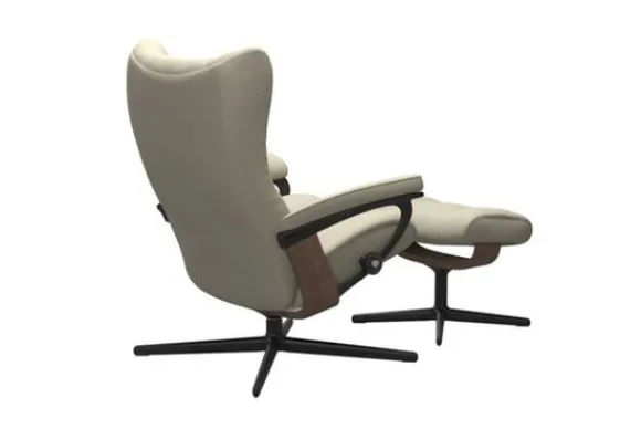 Relaxfauteuil Wing Cross van het merk Stressless is verkrijgbaar in alle kleuren. Tevens is de fauteuil leverbaar in stof en rundleder. Je kunt bij deze fauteuil kiezen uit diverse maten zoals Small, Medium en Large. Deze fauteuil heeft een Plus en Glide Systeem: Aan beide zijden van de fauteuil zit een knop waarmee je de weerstand van de stoel kan aanpassen naar eigen behoefte. Door de knoppen in tegengestelde richting te draaien stel je jouw ideale relaxpositie samen. Op die manier krijgt de nek en de onderrug goede onderstuening. Door de rugleuning naar voren te buigen activeer je de slaapfunctie. Op het moment dan je weer rechtop komt stelt de stoel zichzelf weer bij naar de normale stand.